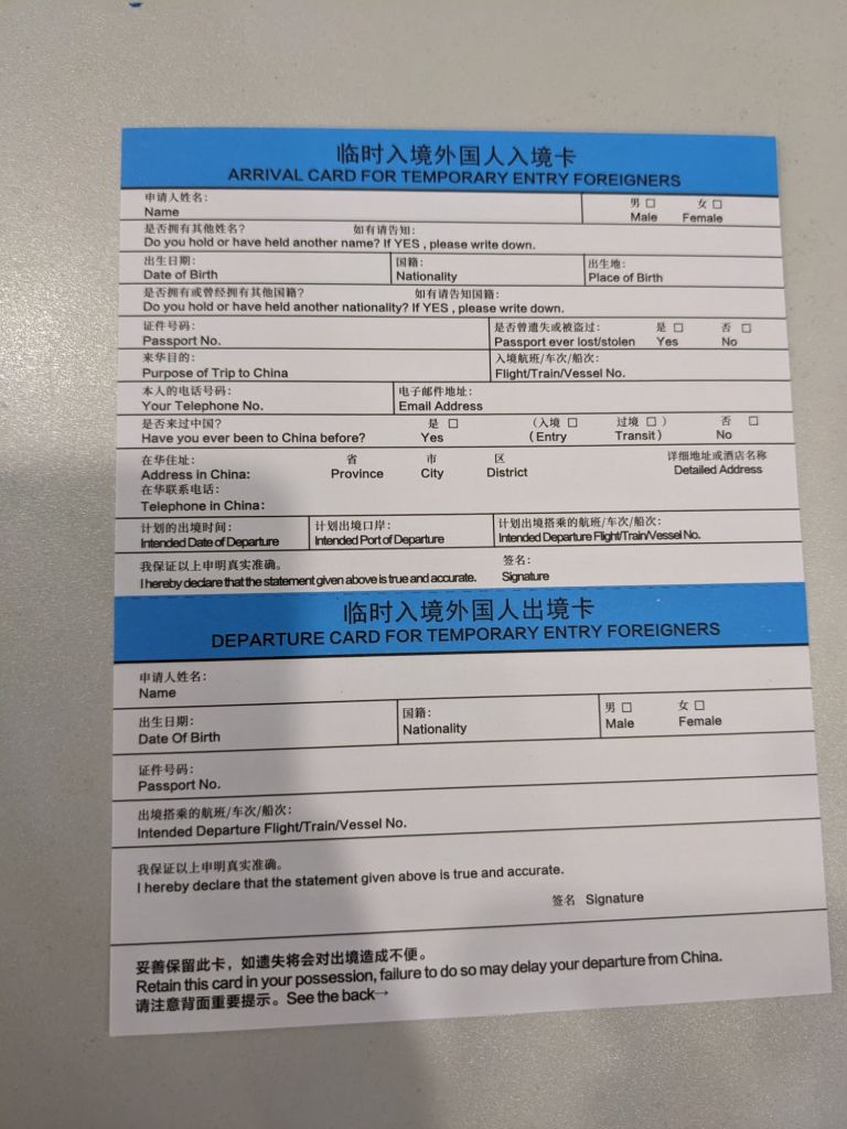 - Get in line with the following: 1) Fingerprint Paper 2) Arrival Card 3) Arrival/Departure Card for Temporary Entry Foreigners 4) Passport 5) Ticket of flight/boat out of China