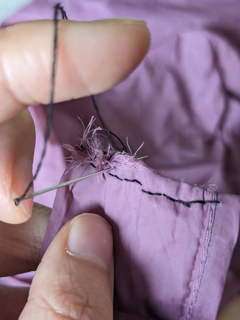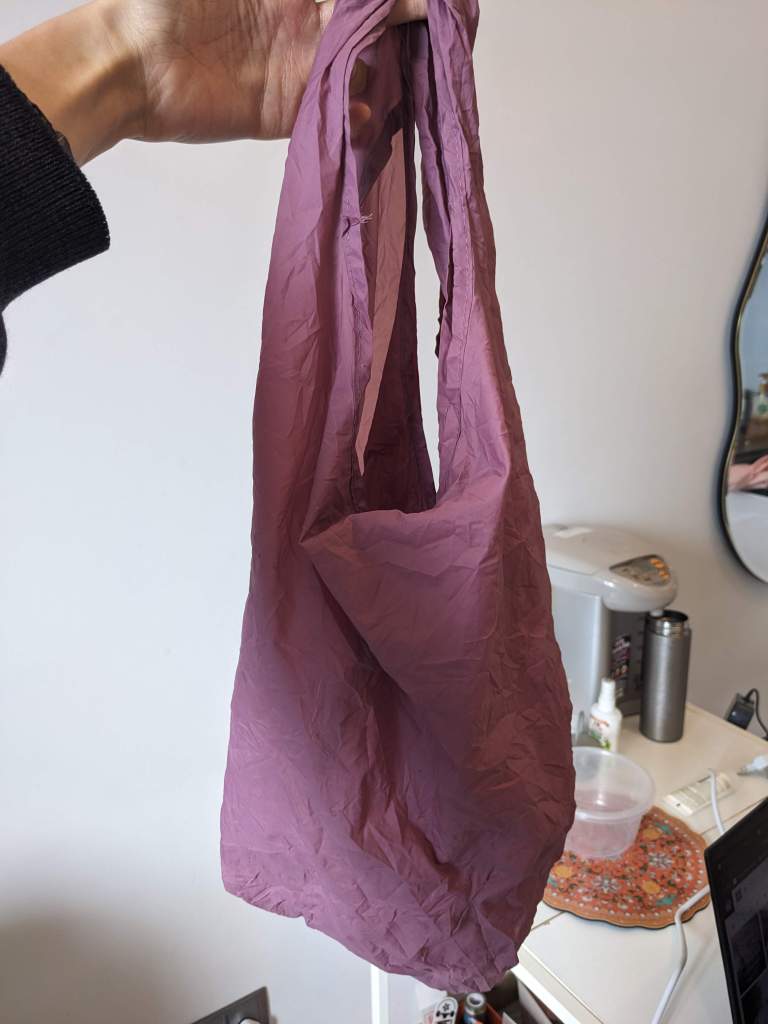 I love this bag! It’s from Daiso in Japan, is super thin, light and has served me so well. The fabric is fairly thin though so I have to repair it every once in a while. Below I was sewing the handle which had frayed and also repaired a small hole.