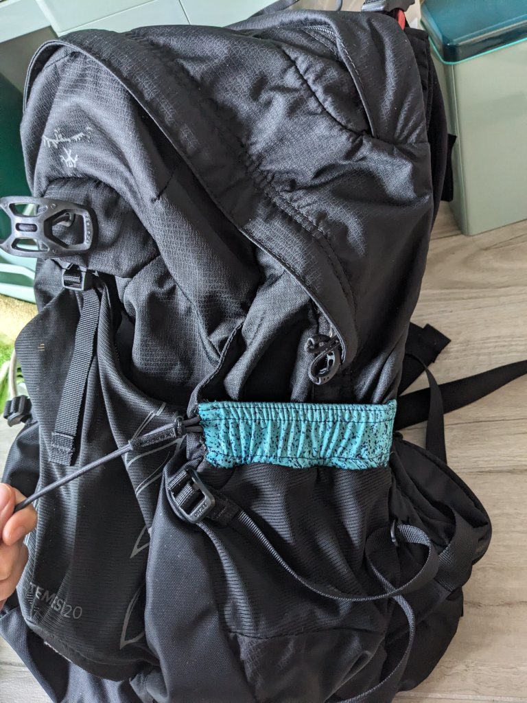 | Extending water bottle holders | 1. Cut fabric to approximately the size of the water bottle pocket 2. Sew down frayed ends 3. Attach the new fabric to the backpack making sure to sew into thick material/seams |