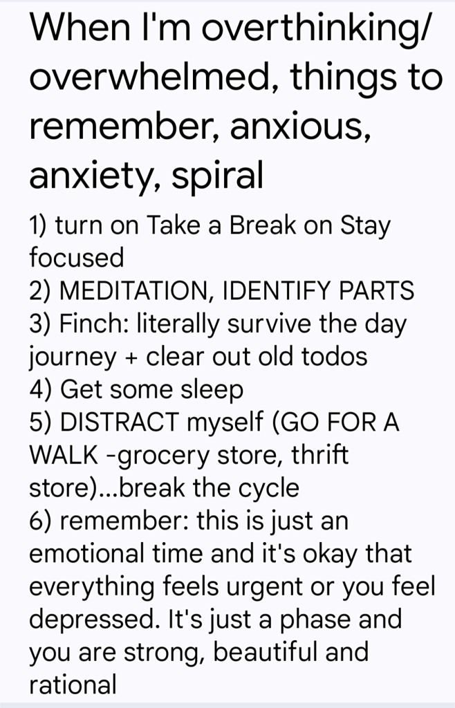 To the right is my checklist that I kept on Google Keep for when I was overwhelmed in the past. It’s not updated now as to what I do currently, but may serve as a way for you to make your own overwhelm checklist. I like using Google Keep as I could find this document using words like “anxious, overwhelmed etc.”