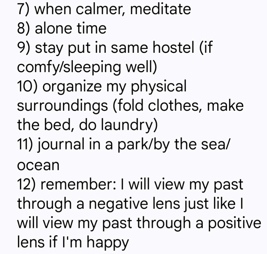 While this was a challenging experience (and helped to deflate my ego of being perfectly strong), it also reminded me that I wanted to share some of the things I used to do to step out of spirals. It can be very hard to remember what to do when a storm arises, but when I was healthy, I knew exactly how to get out of it. As such one time when I was well, I created a checklist of what to do when I was overwhelmed. I kept it in my phone such that I could search it and go through the steps. It was also something I made myself so I knew I could trust it (rather than a random “what do to when overwhelmed” source online…I sometimes have doubts I can follow someone else’s’ advice when my ship is sinking)