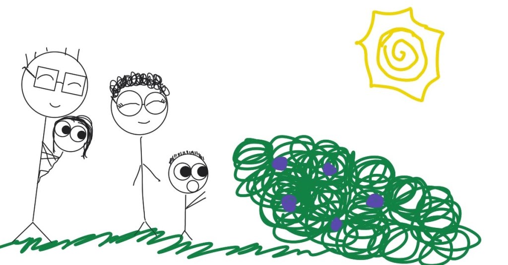 My family, Mom and Dad still together (not divorced yet). My brother was 4 and I was 2 and being held by my dad. We were blackberry picking in the backyard and were so happy. It was a sunny day. The grass was so lush and it was summer.