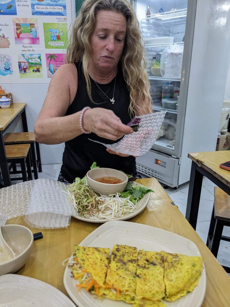 I made friends with Julie – one of my roomies. She was staying on Ho Chi Minh for a longer period and she introduced me to Bánh Xèo…Vietnamese savoury pancake. OMG! How did I not find this on the Chay Khai Tam menu before? It’s like a savoury crepe made with no eggs. You can eat it with rice paper, put herbs on top, fish sauce (or vegetarian version), then the crepe and eat it. My new favourite meal….